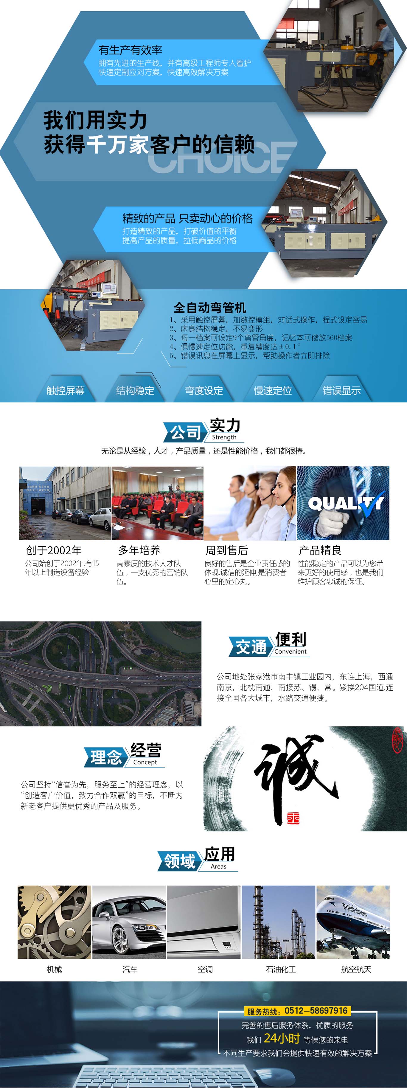 張家港市雙和機械制造有限公司始建于2001年,占地面積12000平方米,南鄰蘇州、無錫、上海,東鄰常州、南京,交通便利,位長三角中間地段,風(fēng)景優(yōu)美的張家港。 雙和公司至創(chuàng)立開始,引進了國外的設(shè)計制造理念,組建了企業(yè)生產(chǎn)管理優(yōu)秀團隊,致力于管材加工機械研發(fā)、設(shè)計、制造。創(chuàng)新的設(shè)計理念,嚴(yán)格的質(zhì)量把關(guān),專業(yè)的售后服務(wù),不斷提升了我在整個行業(yè)的影響力。 雙和公司生產(chǎn)的系列產(chǎn)品分為彎管機、切管機、縮管機、磨齒機、伺服彎管機、數(shù)控彎管機、液壓彎管機、自動切管機、管端成型機、倒角機、大弧滾圓機、鋁切機、壓彎機等管材加工機械,廣泛用于航天業(yè)、造船業(yè)、汽車制造、鍋爐制造、自行車、摩托車、體育健身器材、管制品家...